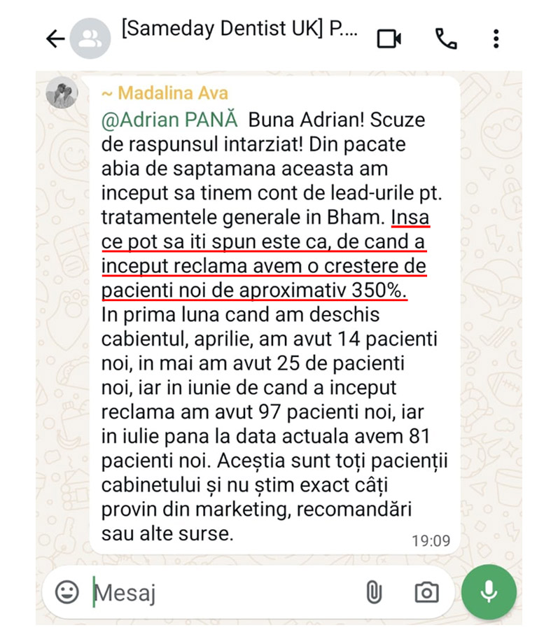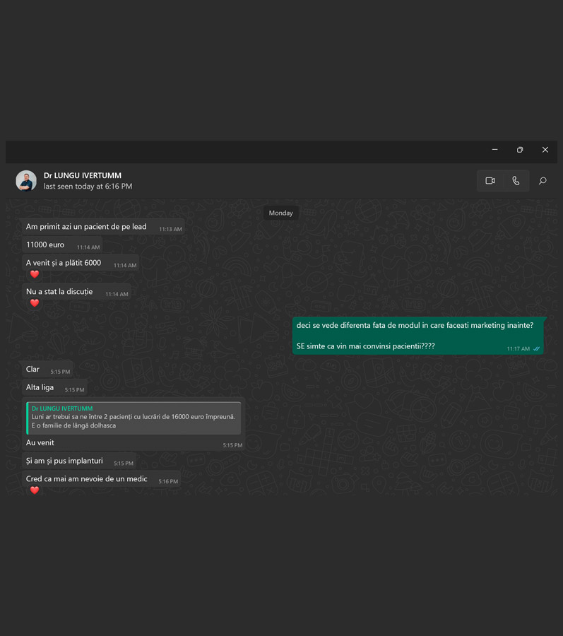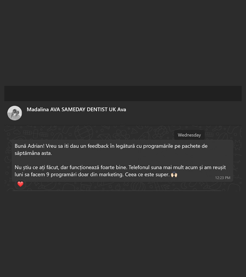 De la primul contact și pănâ la încasarea banilor de la pacienții noi, de la recontactarea pacienților existenți și până la creșterea randamentului acestora, ne ocupăm de toate procesele necesare pentru a-ți crește încasările. Integrăm sisteme de CRM cu pâlnie de vânzări. Formăm personalul din call-center, gestionăm echipa de vânzări.